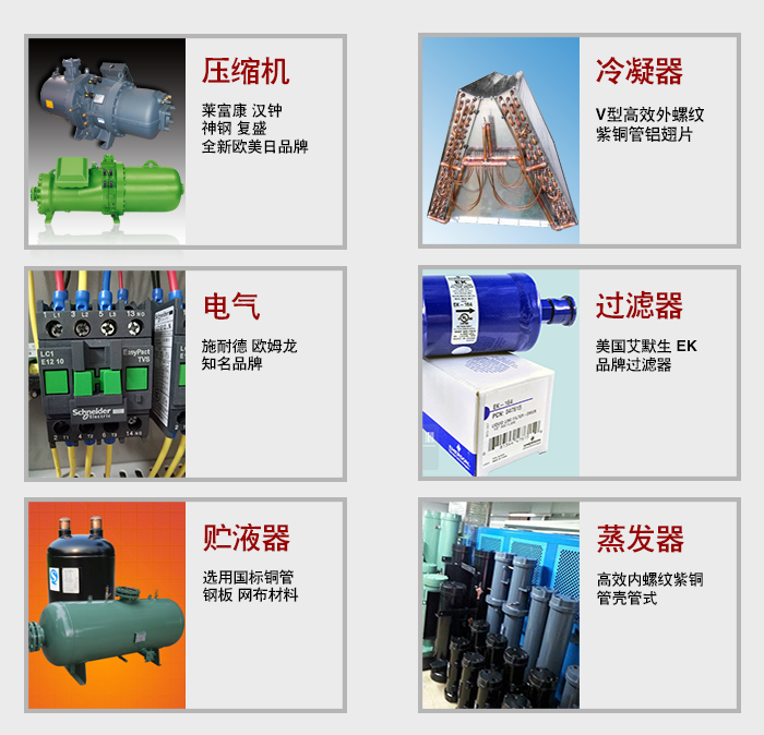 采用意大利萊富康、德國比澤爾、中國臺(tái)灣復(fù)盛、漢鐘半封閉螺桿壓縮機(jī)。